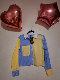 Camisa bicolor arillo y azul manga larga con cuello y corte al ombigo, talla S