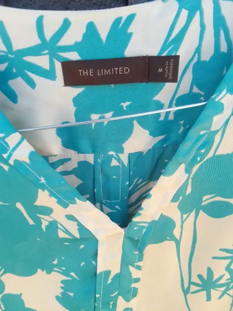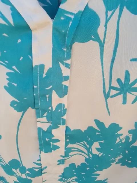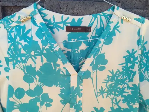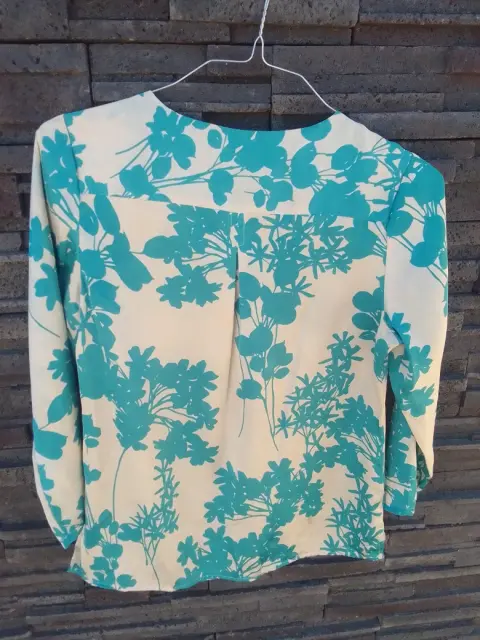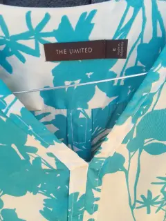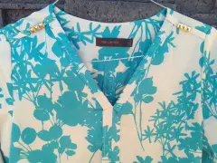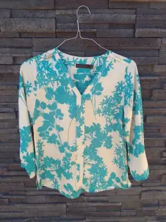 Blusa cuello V de Bouquet de flores. Blusa de vestir con detalles dorados en hombros y mangas.Color beige con azul Turquesa.