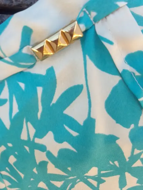 Blusa de vestir con detalles dorados en hombros y mangas.Color beige con azul Turquesa.