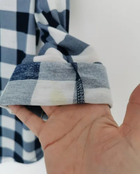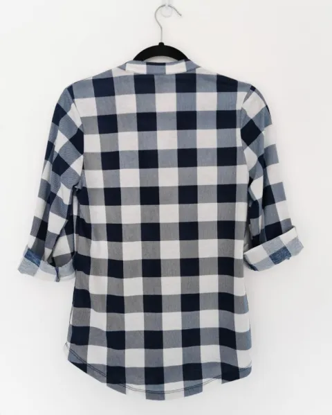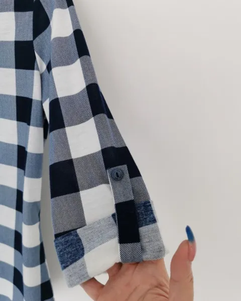 Blusa de tela tipo franela delgada. Color blanco con líneas azules formando cuadros. Mangas 3/4, las mangas se pueden desdoblar, pero la jareta y el botón que las detiene no se suelta. Cuello redondo con solapa. Ojales metálicos con cinta para ajustar el cuello. Talla M.