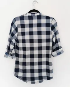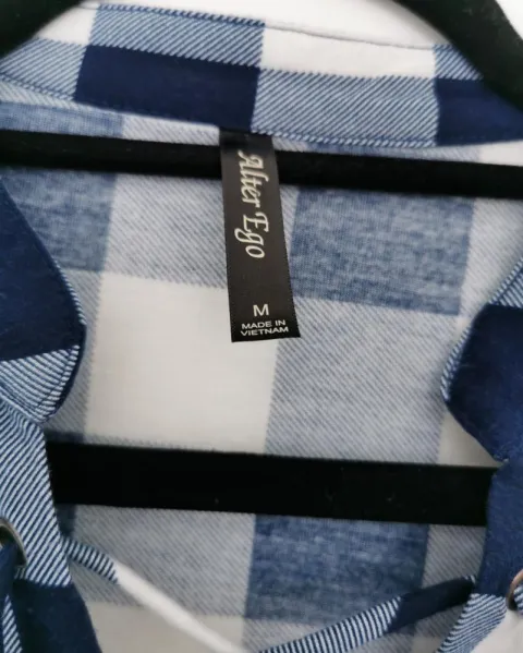 Blusa de franela a cuadros Alter Ego. Blusa de tela tipo franela delgada. Color blanco con líneas azules formando cuadros. Mangas 3/4, las mangas se pueden desdoblar, pero la jareta y el botón que las detiene no se suelta. Cuello redondo con solapa. Ojales metálicos con cinta para ajustar el cuello. Talla M.