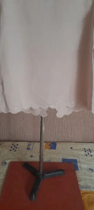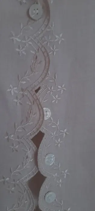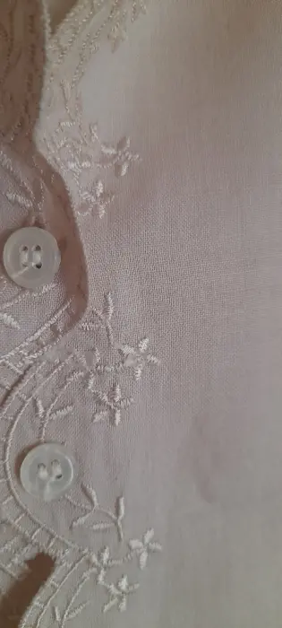 Bordado del mismo tono y bello detalle en mangas, cuello y ruedo. Corte recto, talla G nueva.