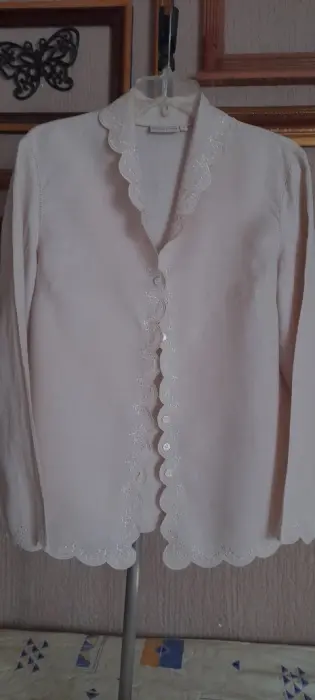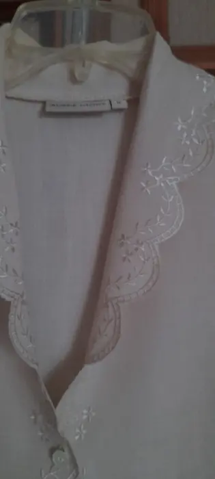 Blusa de lino con bordado nacar. Bordado del mismo tono y bello detalle en mangas, cuello y ruedo. Corte recto, talla G nueva.