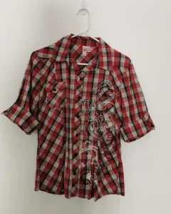 Blusa a cuadros rojos y blancos, con bolsillos de parche con solapa y boton al pecho. Mangas 3/4 con cintilla y botón para sostenerlas dobladas, no tienen puños. Tiene un dibujo y detalle de pequeños estoperoles al frente. Talla L.