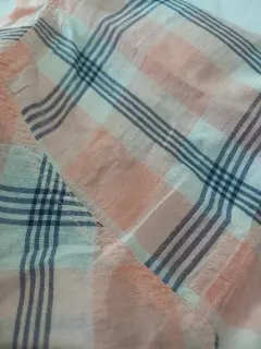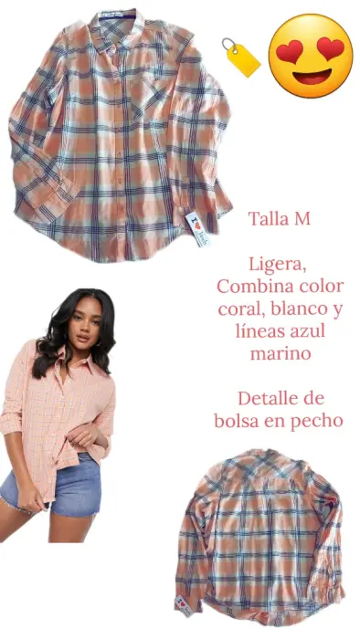 Camisa a Cuadros. Combina colores en blanco, melón y azul marino, la tela es ligera, tipo gasa, se mi transparente. Tiene botones al frente y una bolsa en pecho. Hermosa