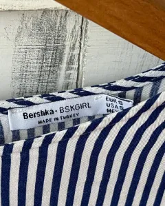 Camisa a rayas azules Bershka. Talla: STela suave y fresca, base blanca y rayas azules.En el puño izquierdo el resorte se aflojó. Se abotona en el cuello por atrás.Medidas: 38 cm de hombros, 47 cm de axila y 46.5 cm de largo.