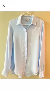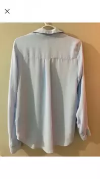 Camisa azul H&M. Es azul cielo, el color se ve mas vibrante en vivo. Recomiendo a una talla M o incluso G porque viene bastante holgada. Tiene mancha en la axila por el uso (subo foto)
