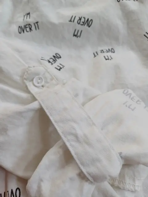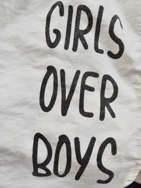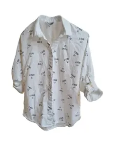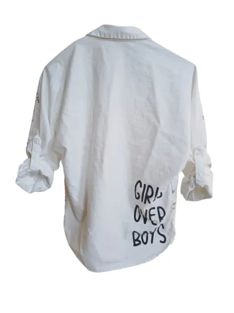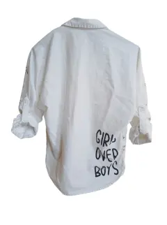 Camisa Blanca. Camisa con botones, color blanco, manga larga, con estampado en color negro con la frase "I'm Over It" y frase en la parte trasera en la esquina inferior derecha "Girls Over Boys", Marca That's It, talla 14 en niña, que a una talla chica (s) en adulto.