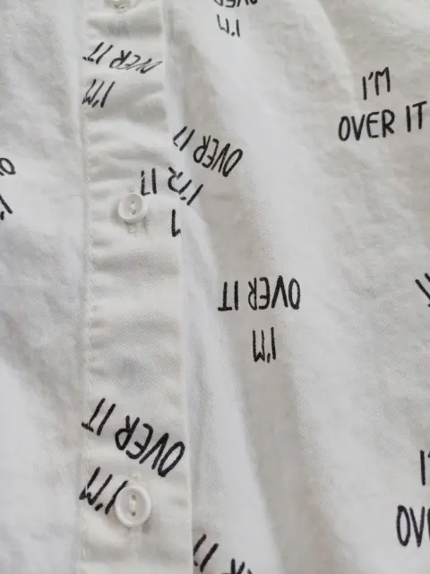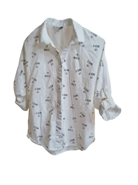 Camisa con botones, color blanco, manga larga, con estampado en color negro con la frase "I'm Over It" y frase en la parte trasera en la esquina inferior derecha "Girls Over Boys", Marca That's It, talla 14 en niña, que a una talla chica (s) en adulto.