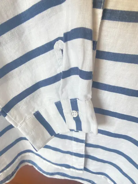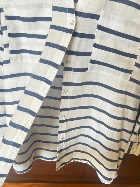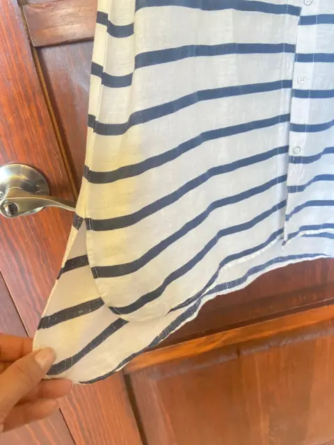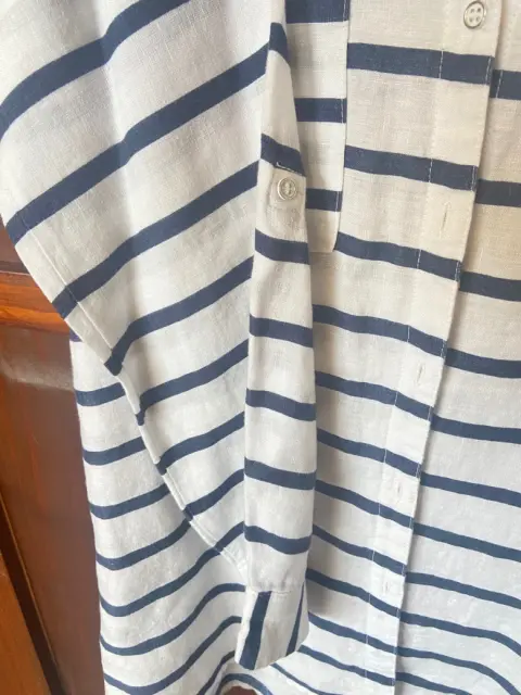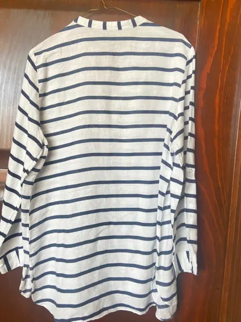 Camisa blanca a rayas. Muy combinable y hermosa camisa a rayas azul marino con manga larga y se dobla a 3/4, tiene todos sus botones, sin manchas 🌟 Mide: axila a axila 54cm, cintura 51cm, largo enfrente 71cm y atrás 73cm