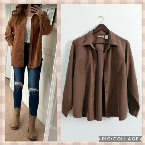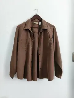 Tono café chocolate.Talla LBolsas al frente.Tela rayón y poliéster (tipo pana)No tiene strech.La puedes usar similar a la foto 1 de referencia.Axila a axila: 55 cmHombros: 44 cmLargo: 66 cm