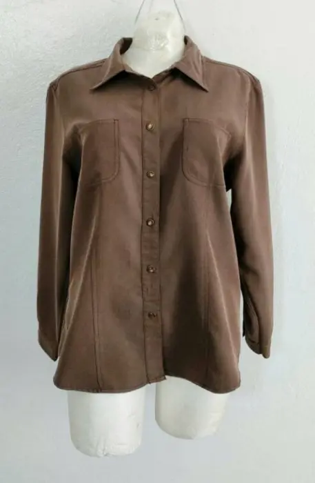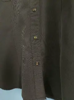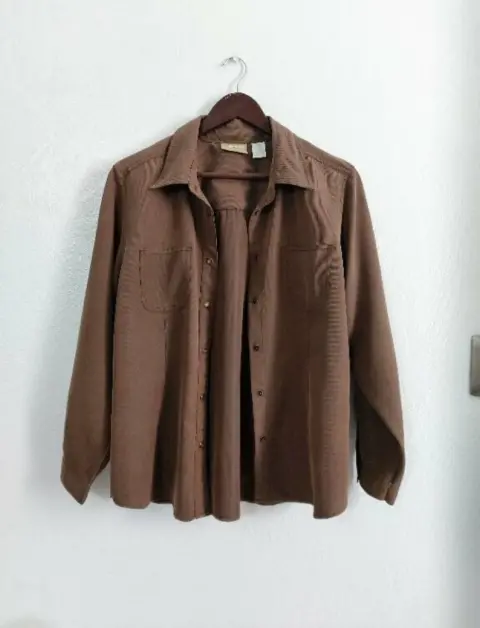 Camisa café tipo pana. Tono café chocolate.Talla LBolsas al frente.Tela rayón y poliéster (tipo pana)No tiene strech.La puedes usar similar a la foto 1 de referencia.Axila a axila: 55 cmHombros: 44 cmLargo: 66 cm
