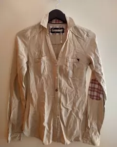 Camisa color Caqui Marca Bershka, no estoy segura de la talla, pero si es CH/S/XS, más o menos. La camisa está muy bonita, la tela no es tan gruesa por lo que no te acaloras cuando la usas, tiene todos sus botones, es usada pero está en muy buenas condiciones, sin enmendaduras, sin manchas que alteren el diseño o el color sin detalles exteriores, la tela es de fácil planchado y lavado, no es rígida, es suave y no pica.