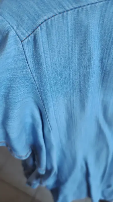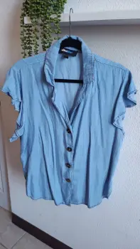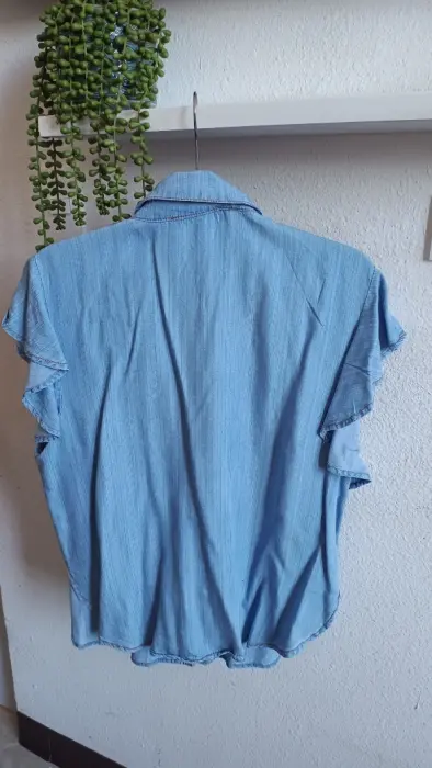 Hermosa camisa color mezclilla, la tela es suave y fresca, es una mezclilla muy muy delgada y con movimiento, puedes usarla abierta o cerrada. Hermoso corte redondo. Talla L. Sin detalles.Hombro. 39 cmAxila. 52 cmAncho. 54 cmLargo. 64 cm