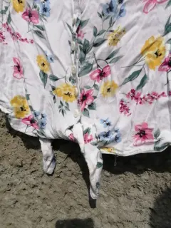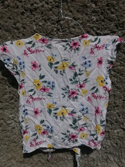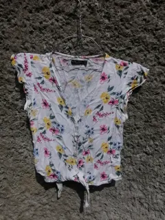 Camisa corta floreada. Camisa tipo top con estampado floreado, manga corta, botones al frente y un pequeño lazo para moño