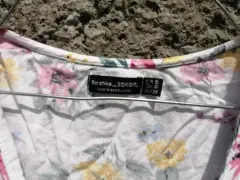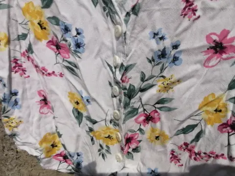 Camisa tipo top con estampado floreado, manga corta, botones al frente y un pequeño lazo para moño