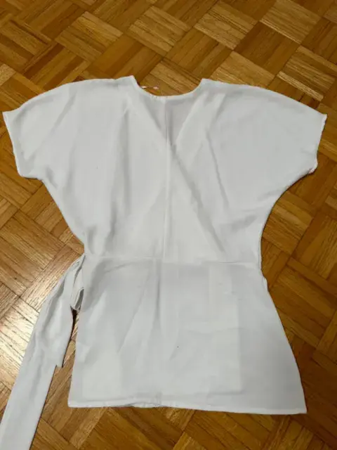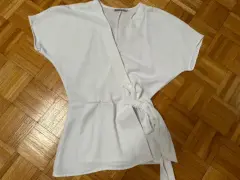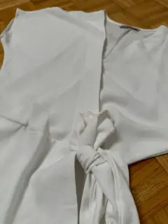 Camisa cruzada color blanca de manga corta, ajusta los listones en la cintura y de su largo llega abajo de las caderas, la tela es es fresca.Puesta 1 sola vez En perfecto estado