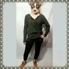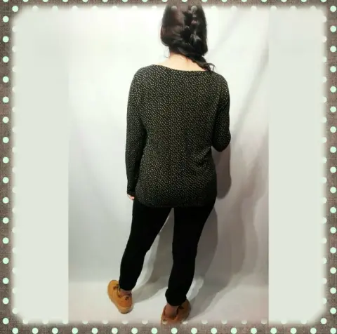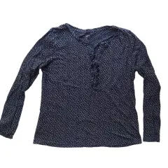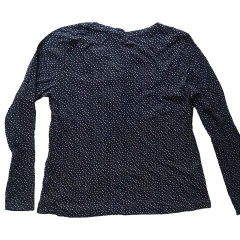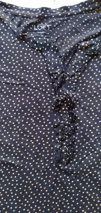 Camisa negra con lunares amarillos, marca Loft talla L, con botones al centro. 100% algodón.Hombro a hombro 40 cm.Axila a axila 50 cm.Largo total 60 cm.Si te gusta otra prenda, puedo hacerte un paquete y mejorar el precio.