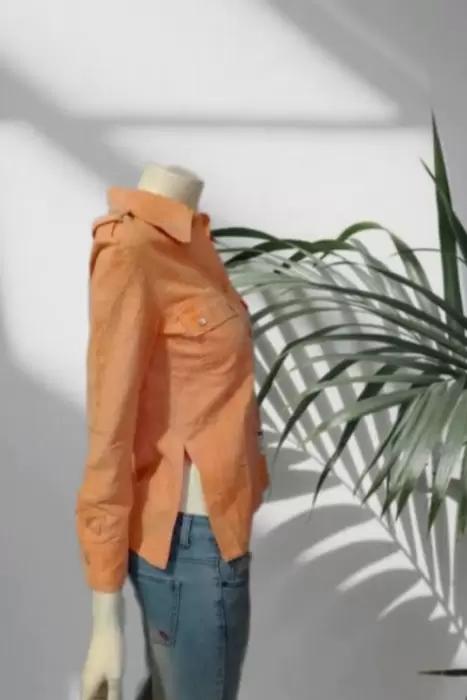 Camisa de Mezclilla tipo camisera, con aberturas en costados, Color Naranja con lindo Estampado Bordado. Talla-S