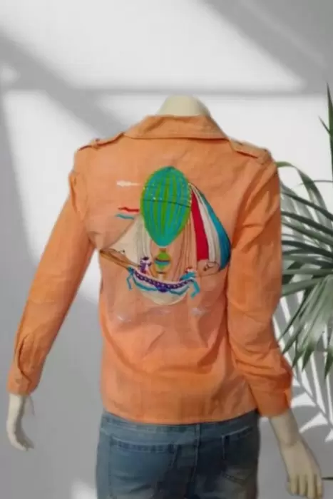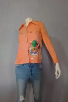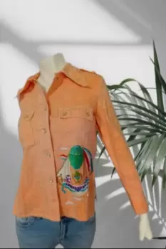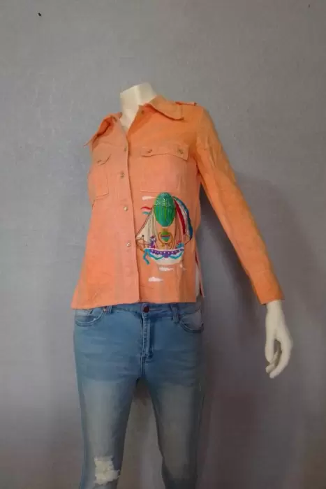 Camisa de Mezclilla. Camisa de Mezclilla tipo camisera, con aberturas en costados, Color Naranja con lindo Estampado Bordado. Talla-S