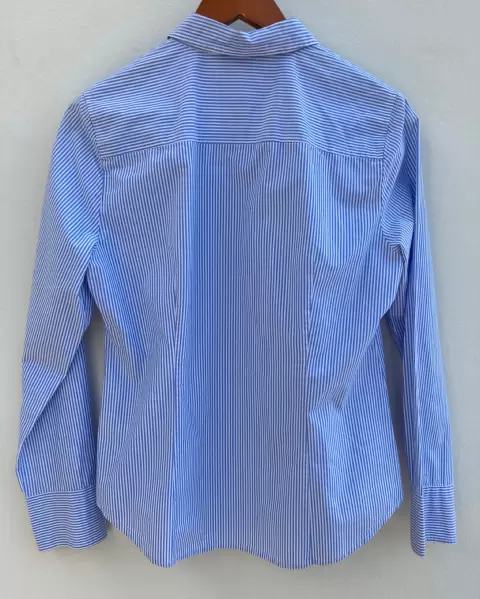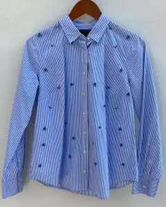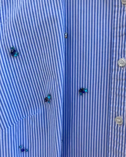 Camisa talla 10 de EU, de corte ajustado. La tela es de rayas azul y blanco y tiene aplicaciones de piedras.