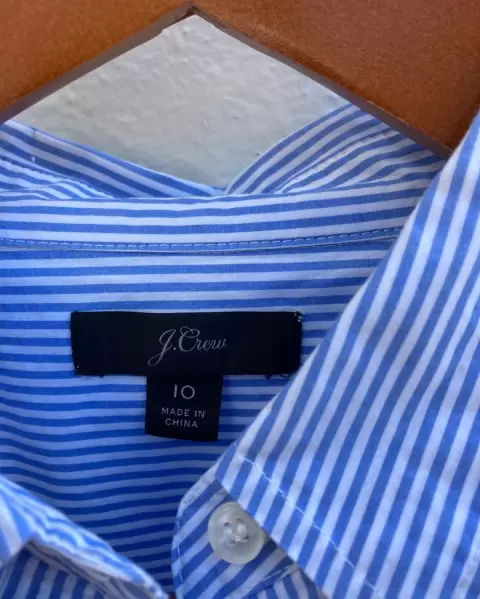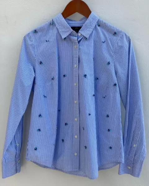 Camisa de rayas J.Crew. Camisa talla 10 de EU, de corte ajustado. La tela es de rayas azul y blanco y tiene aplicaciones de piedras.