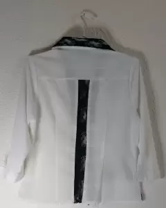 Camisa de vestir blanca con detalles nefros. Camisa blanca lisa medio transparente con detalles de encaje negro en la zona de botones, cuellos y puñosIdeal para,llevar con un pantalón negro elegante