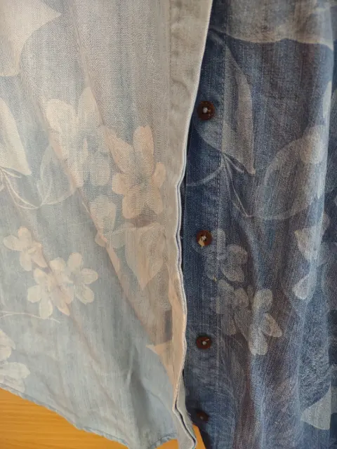 Camisa denim 2 tonos azul de desigual. Camisa casual de mezclilla en tonos azul con detalle de flores.