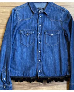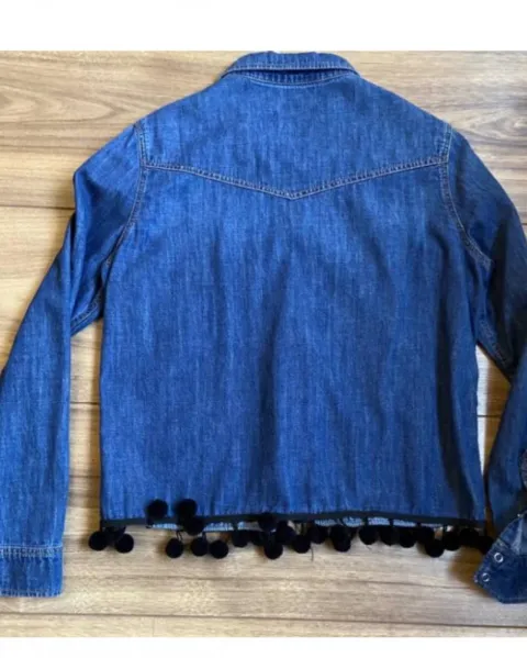 Camisa denim con detalle de pompones negros en la parte baja, estilo boho, talla S, nueva pero se le quitó la etiqueta y nunca se usó.