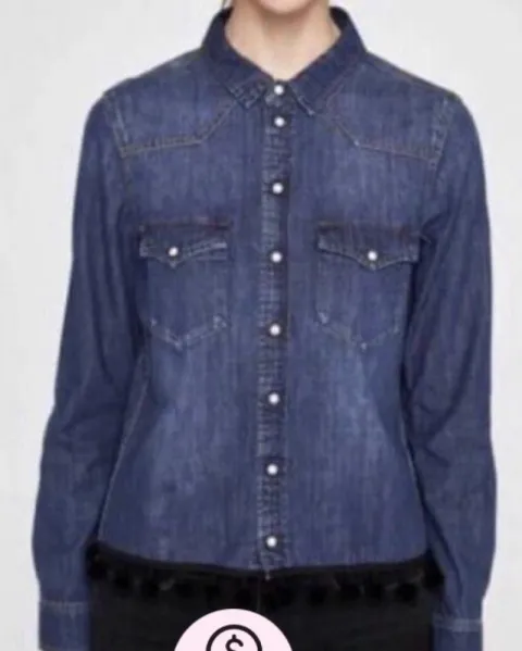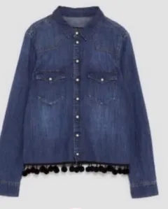 Camisa denim pompones ZARA NUEVA. Camisa denim con detalle de pompones negros en la parte baja, estilo boho, talla S, nueva pero se le quitó la etiqueta y nunca se usó.