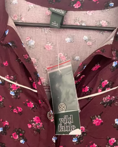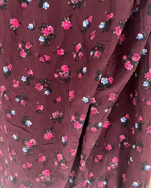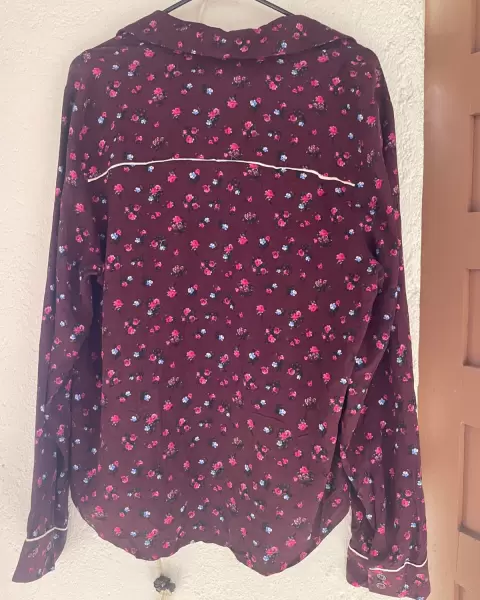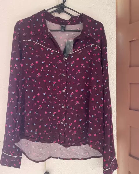 Camisa con estampado de flores , bonito diseño , botones al frente . La parte trasera es ligeramente más grande que la de enfrente .
