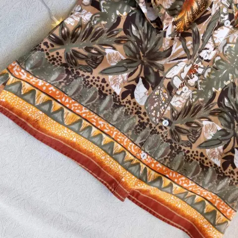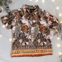 Hermosa camisa floreada tiene colores muy bonitos.Es estilo hawaiano.Queda muy bonita por qué es suelta.