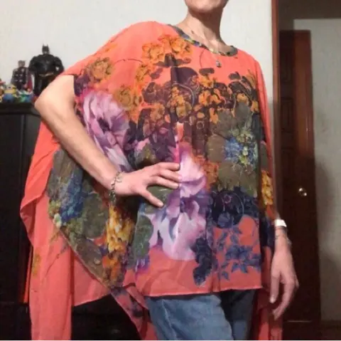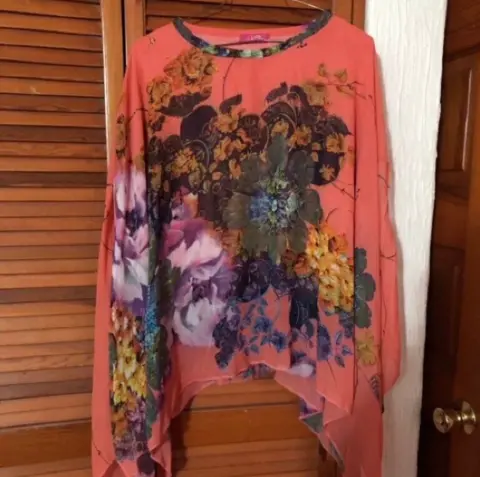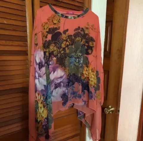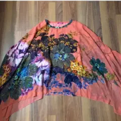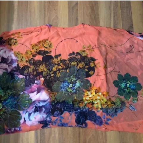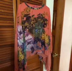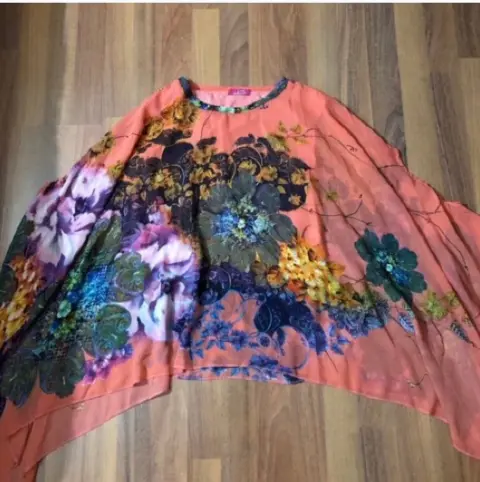 Camisa floral con transparencias, manga 3/4, color salmón, talla mediana, con blusa interior de tirantes corta