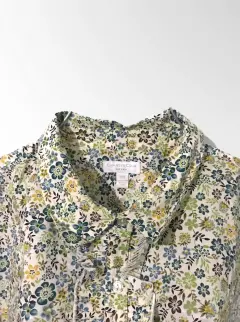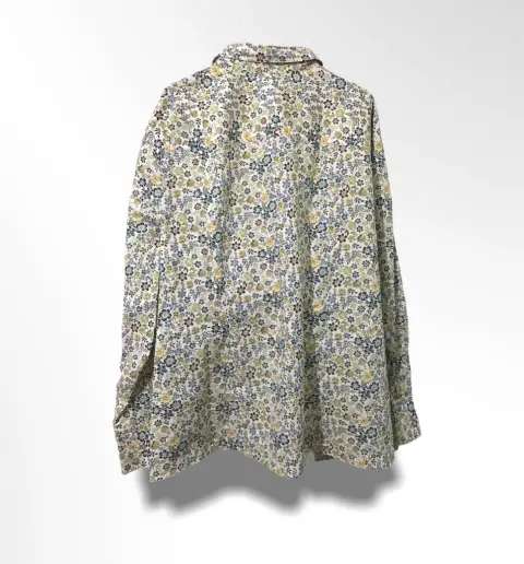 Camisa floreada de cierre de botón, pequeños olanes enfrente color verde agua y olivo con azul egeo. medidas: Hombros: 45 cm, Busto: 53 cm, Cintura: 54 cm, Altura: 63 cm, Hombro a la manga: 53 cm