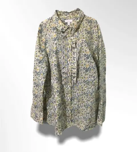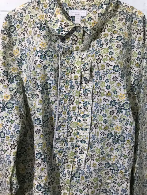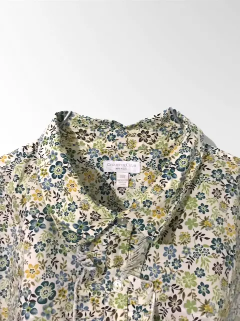 Camisa floreada verde Charters Club. Camisa floreada de cierre de botón, pequeños olanes enfrente color verde agua y olivo con azul egeo. medidas: Hombros: 45 cm, Busto: 53 cm, Cintura: 54 cm, Altura: 63 cm, Hombro a la manga: 53 cm