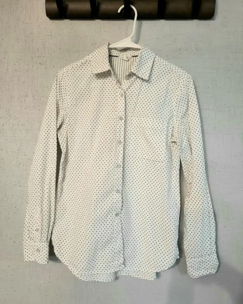 Camisa talla S Aeropostale dama, blanca con lunares azul marino. Tiene un largo de 70cm, 100% Cotton usada en una ocasión, es comoda y de excelente calidad, cuenta con dos botones extras