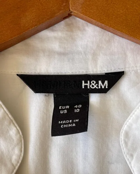 Camisa manga corta H&M. Talla: M (10)Medidas: 44 cm hombros, 51.5 cm axila y 52 cm de largo.El color lo veo entre blanco y beige.Camisa manga corta de algodón, fresca, escote en V y se abotona al frente.