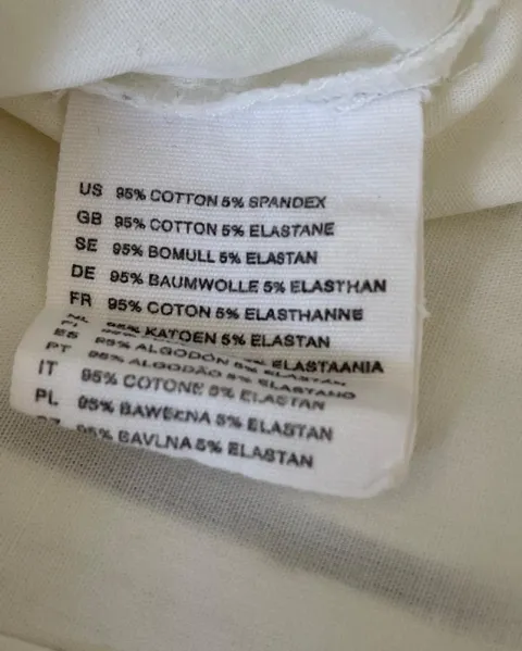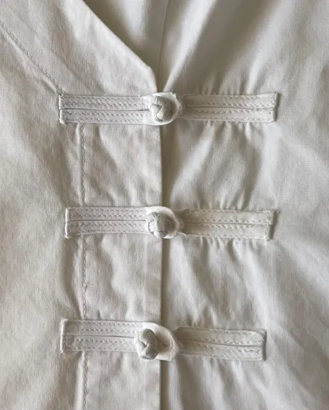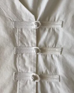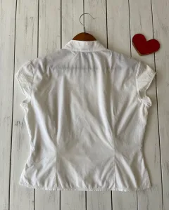 Talla: M (10)Medidas: 44 cm hombros, 51.5 cm axila y 52 cm de largo.El color lo veo entre blanco y beige.Camisa manga corta de algodón, fresca, escote en V y se abotona al frente.