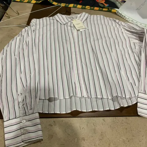 Camisa Mango. Bonita camisa corta y ancha talla L Mango, ideal para andar relax 😎, puedes usarla con Jeans o con un pantalón amplio se ver súper cool ! Totalmente nueva Medidas axila 61, contorno cintura corta 62 largo frente 49, largo espalda 62, Largo mangas 56. Acepto ofertas razonables ya que la prenda está totalmente nueva.