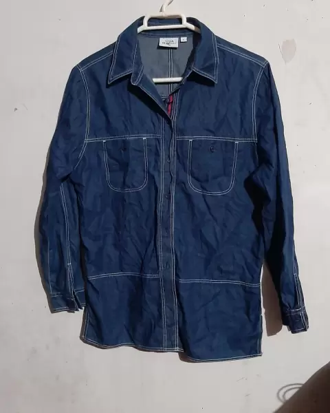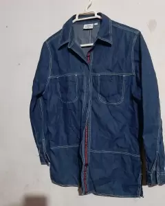 Camisa mezclilla azul. Camisa ligera mezclilla con grecas blancas detalle rojo en botones con abertura a los lados puede usarse cerrada o abierta como camisola manga larga nuevecita , se va a un superprecio