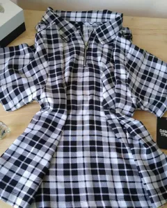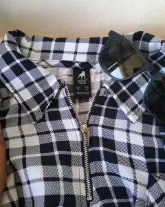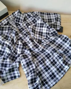 Camisa con cuadros blancos y negros, talla G, manga corta. Material fresco, muy ligera.