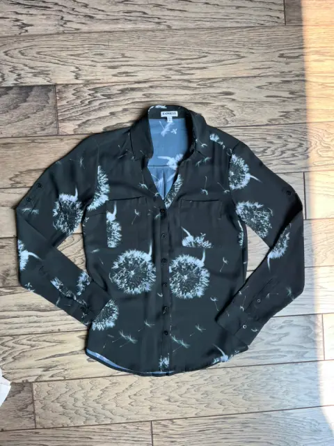 Hermosa camisa de la marca Express color negra con detalles de flor Manga larga con botones para poder hacer manga 3/4 43cm de axila a axila Puesta una sola vez