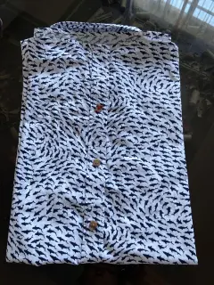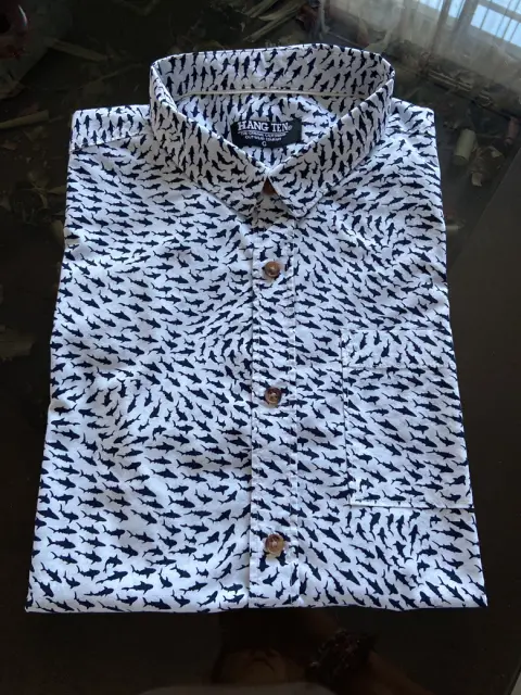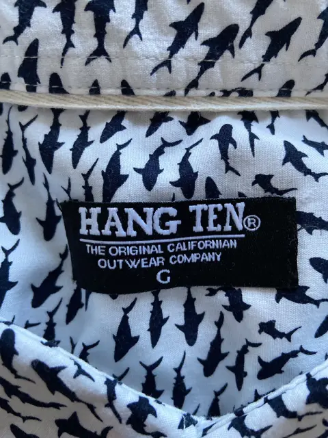 Camisa para Niño manga corta talla G, marca Hang Ten con tiburones en azul marino.