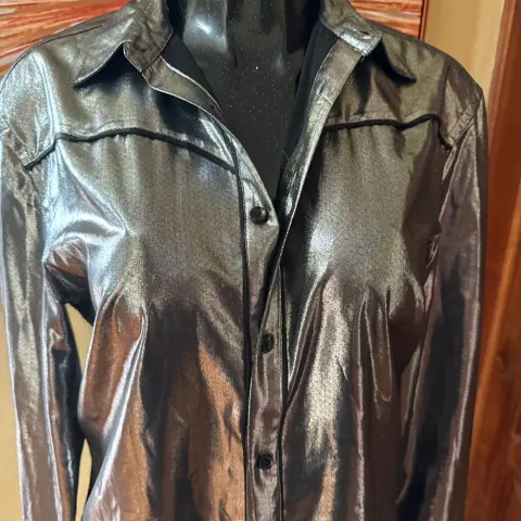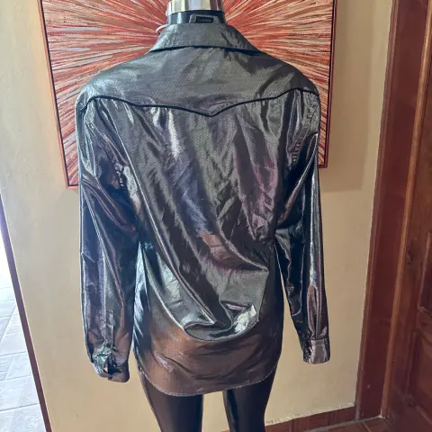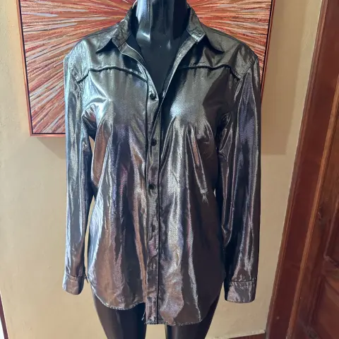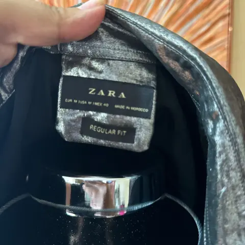 Camisa plata marca zara. Es talla mediana y el corte es largo, abajo de la pompis, sin detalle es tela ligera pero brilla mucho