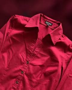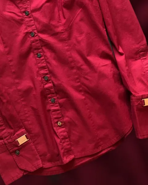 Camisa cuello abierto con botones en un vibrante color rojo terracota y con detalles dorados en las mangas.