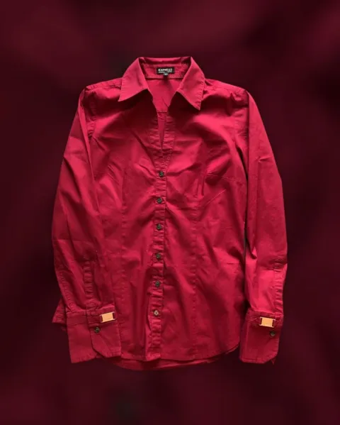 Camisa Terracota Express. Camisa cuello abierto con botones en un vibrante color rojo terracota y con detalles dorados en las mangas.
