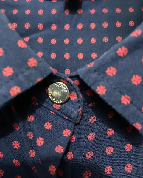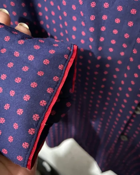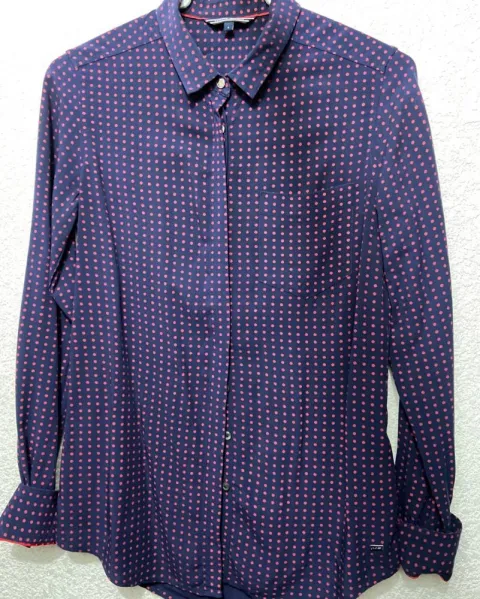 Camisa Azul marino con florecitas en rosa, manga larga , botón oculto, en los puños tiene detalles en rosa q se ven padres. En perfectas condiciones. Talla 6