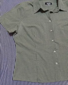 Camisera Verde Cuadritos. Blusa camisera con pinzas, estampado de minicuadritos negros fondo verde manzana.Hombro: 45 cmBusto: 120 cmCintura: 104 cmCadera: 110 cmLargo: 60 cmLa blusa es usada, no rota, no manchada. ♻️ Nuestros empaques van en cajas/sobres reciclados ♻️