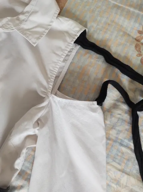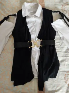 Conjunto de chaleco Nonstop y camisa de cuello, transparenta, sin hombros y con listones.negros para amarrar. Al chaleco le puedes poner cinturón