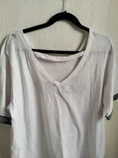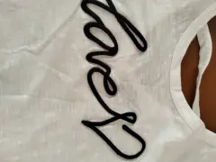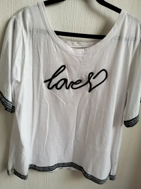 Fresca y bonita playera blanca con aplicaciones de canutillo en mangas y caída de la blusa cuello redondo espalda en V con tira. frente palabra love en relieve de tela